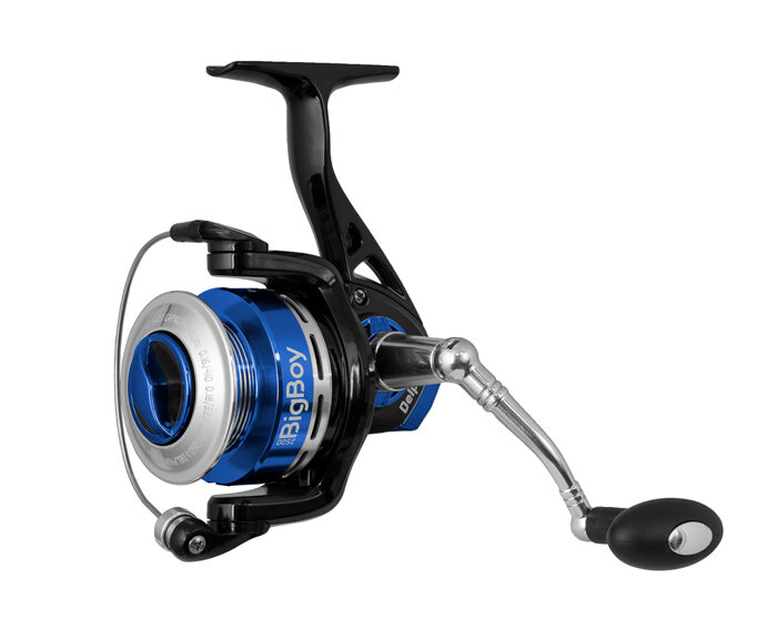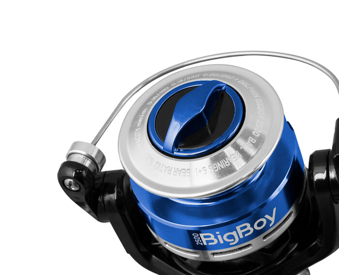 Un moulinet rapide avec un bâti petit et la bobine taille 2500. La construction légère contient le ratio 6.2:1, capable de faire agir votre montage dans un instant. Les roulements 6 + 1 garantissent le fonctionnement lisse. Vous pouvez absolument compter sur le frein avant et le BIG BOY sera votre compagnon fiable pour la pêche bolognaise, match, ou même pêche à la traîne. Tous les composants sont cachés dans le bâti plastique solide, mais léger et vous n'allez pas sentir la fatigue après la longue pêche. La manivelle métallique avec un grip caoutchouc confortable est convenable pour la main gauche ou droite. Le fonctionnement du moulinet est silencieux, cohérent et sans vibrations. La bobine métallique avec les détails bleus souligne le caractère unique de ce grand petit combattant.