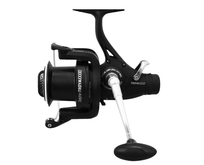 Delphin TROYA est un moulinet débrayable de grande capacité pour la pêche aux distances grandes et moyennes. Il a un frein « Power Drag » capable de complètement arrêter la bobine par un tour de frein haute. En pratique, ça signifie que par le réglage de frein avant la pêche, le pêcheur est capable de manipuler le frein « au quart de tour » pendant le combat, ce qui est particulièrement convenable avec les poissons agressifs. Le rotor a une vis sans fin avec un axe principal en diamѐtre 6 mm ! TROYA est muni de 6 roulements à billes et d'un roulement unidirectionnel. Les roulements sont disposés ainsi : 2 pièces sur l'engrenage interne (un roulement des deux côtés), 2 pièces pour fixer une vis sans fin, 2 pièces sur l'axe principal et un roulement « simple ». Les rondelles garantissent le fonctionnement fluide sans à-coups. Chaque moulinet contient un « paquet de service » : le frein Power Drag et une vis de manivelle supplémentaire.