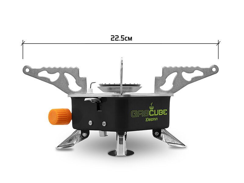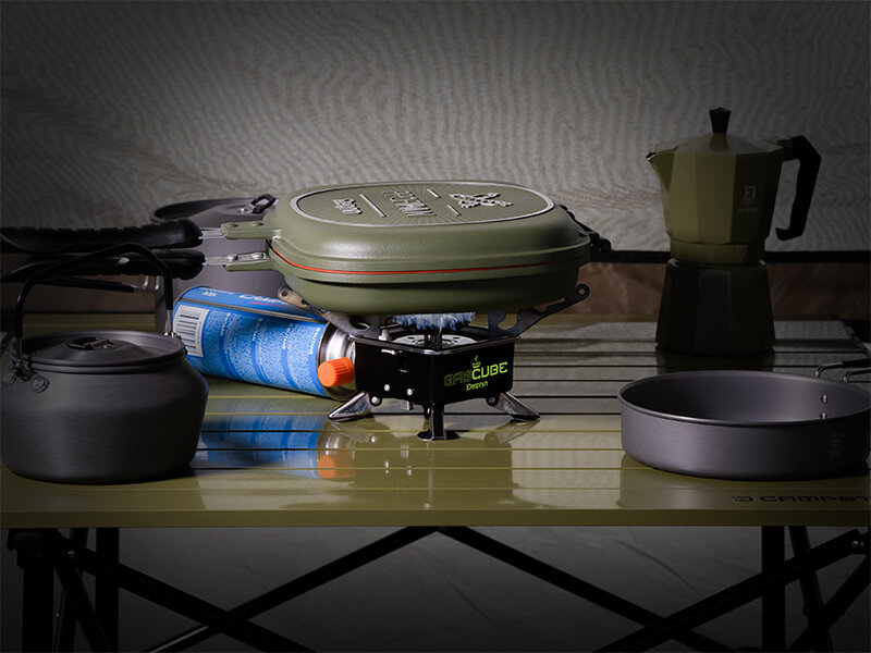 GASCUBE a des pieds repliables, ce qui lui permet d'être positionné de manière stable sur le terrain sans aucun problème. Les bras pliants ont deux positions, pliés ou dépliés, dépendant de la taille de votre tasse ou poêle. Le design est noir avec des éléments verts.